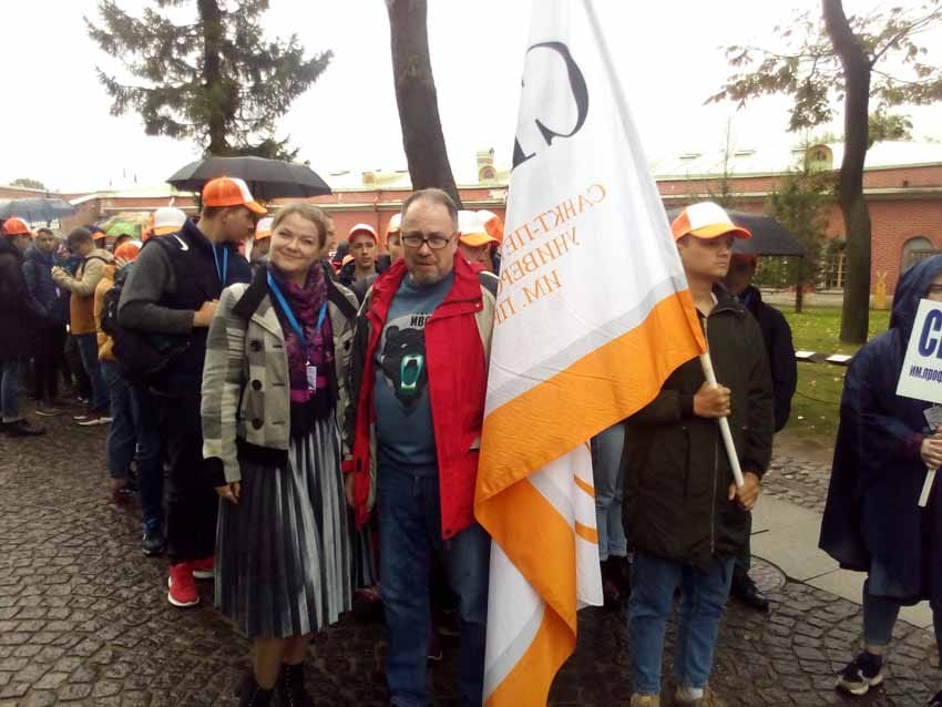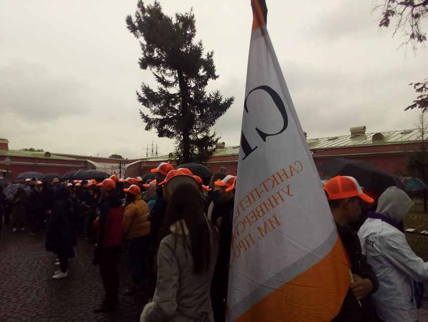 Яркое событие в историческом центре города началось с праздничного шествия. Колонны вузов прошли от Петровских ворот до Петропавловского собора и далее к Нарышкину бастиону. Наша колонна в оранжевых бейсболках была очень заметной и достойно представила наш вуз. У Нарышкина бастиона с пожеланиями успехов в учебе и жизни к студентам обратились председатель Комитета по науке и высшей школе Максимов А.С., руководители вузов, представители науки, культуры и спорта, общественные и политические деятели.